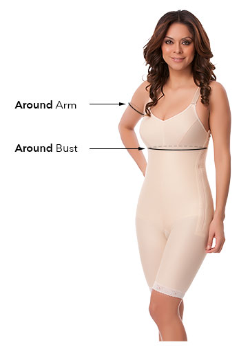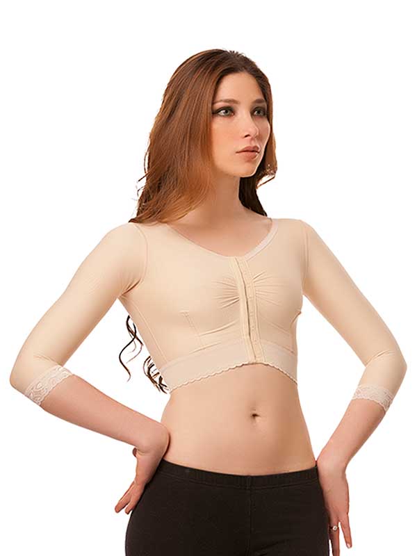 This compression vest and bra combination has a front hook and eye closure with a 3″ band. The sleeves end slightly below the elbow, and the vest length ends just below the bust. This garment is ideal to enhance the recovery of an arm lift, liposuction, and breast surgery. When used correctly, surgical compression vests will reduce swelling, protect, and stabilise the breast area during the recovery period. 100% Latex Free. No underwiring.